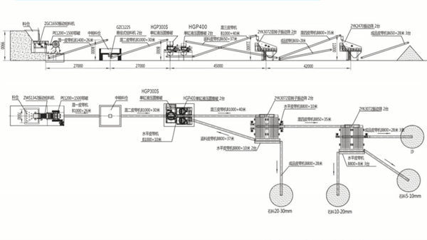 時產(chǎn)500-600噸硬巖骨料生產(chǎn)線方案平面布置圖(生產(chǎn)線總功率: 1370kW)